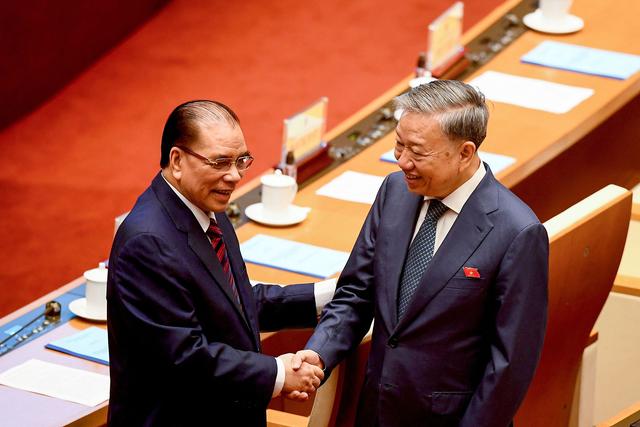 当地时间2024年5月20日,越南河内,越南第十五届国会第七次会议上,越南公安部长苏林将出任国家主席,苏林与越共前总书记农德孟(左)握手。