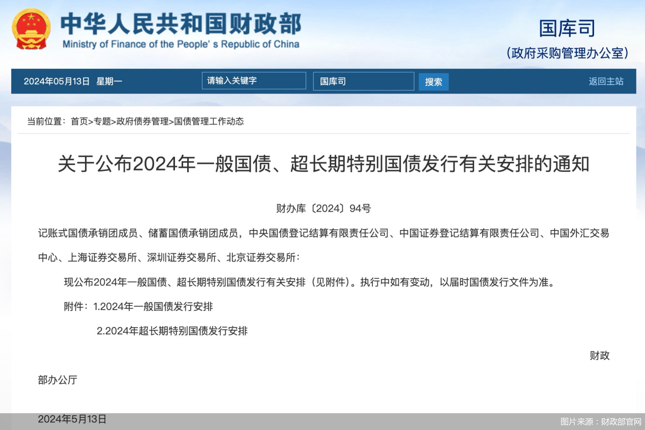 超长期特别国债传来新消息。5月13日,财政部官网公布2024年一般国债、超长期特别国债发行有关安排的通知,超长期特别国债涉及品种包括20年、30年、50年等多个类别,其中30年期产品将于5月17日首发。