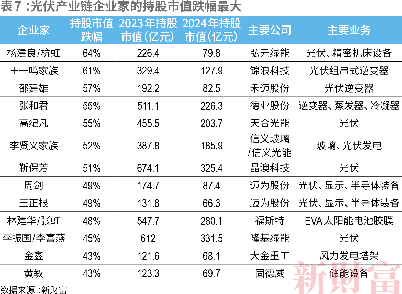 2024年持股市值跌幅最大的50人中,13人来自风光储产业链。天合光能高纪凡、晶澳科技(002459)靳保芳、隆基绿能(601012)李振国等企业家,持股市值全部腰斩。