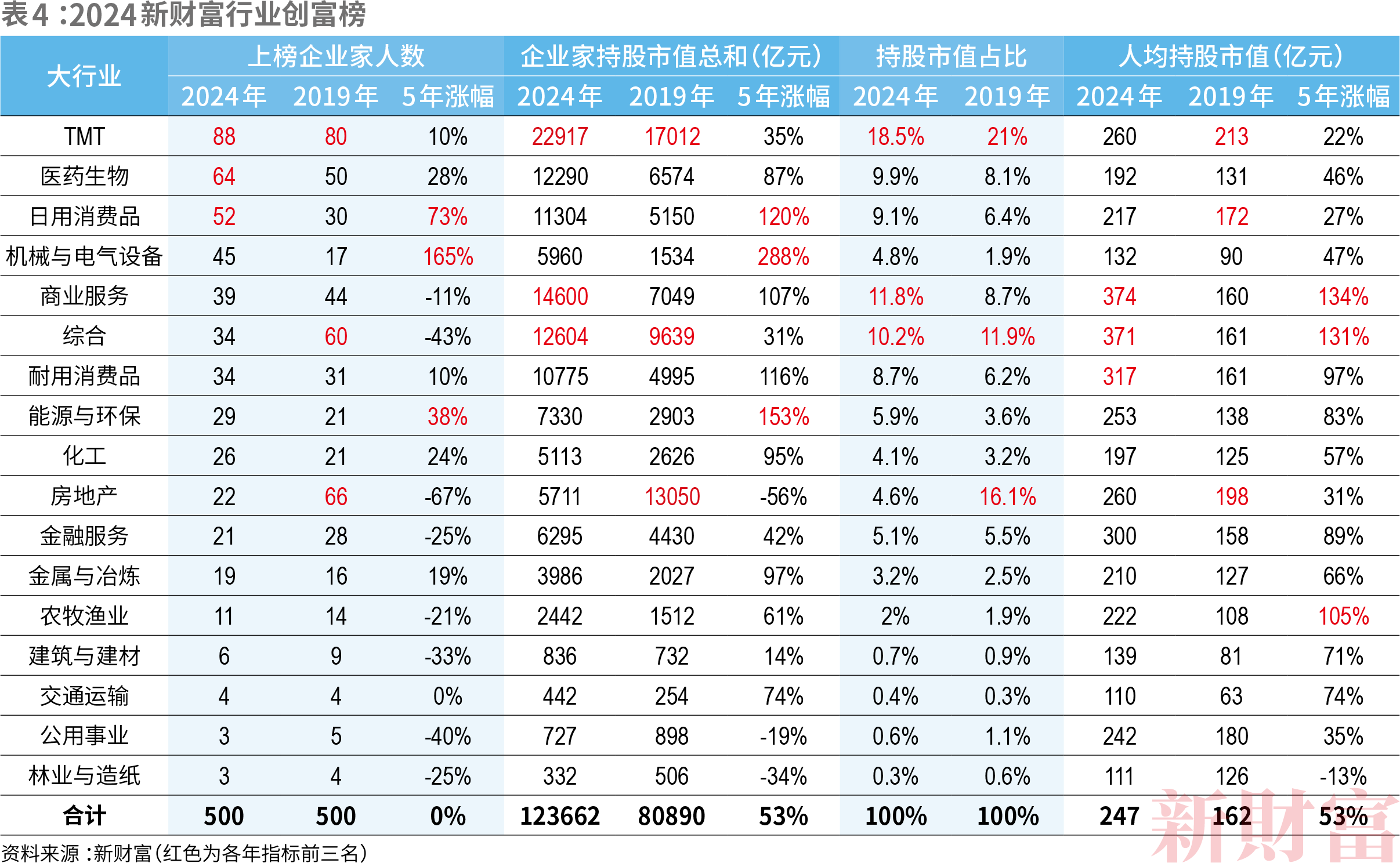 2024年,TMT(88人)、医药生物(64人)、日用消费品(52人)成为创富榜前三大行业。5年前,则是TMT、房地产、综合行业。