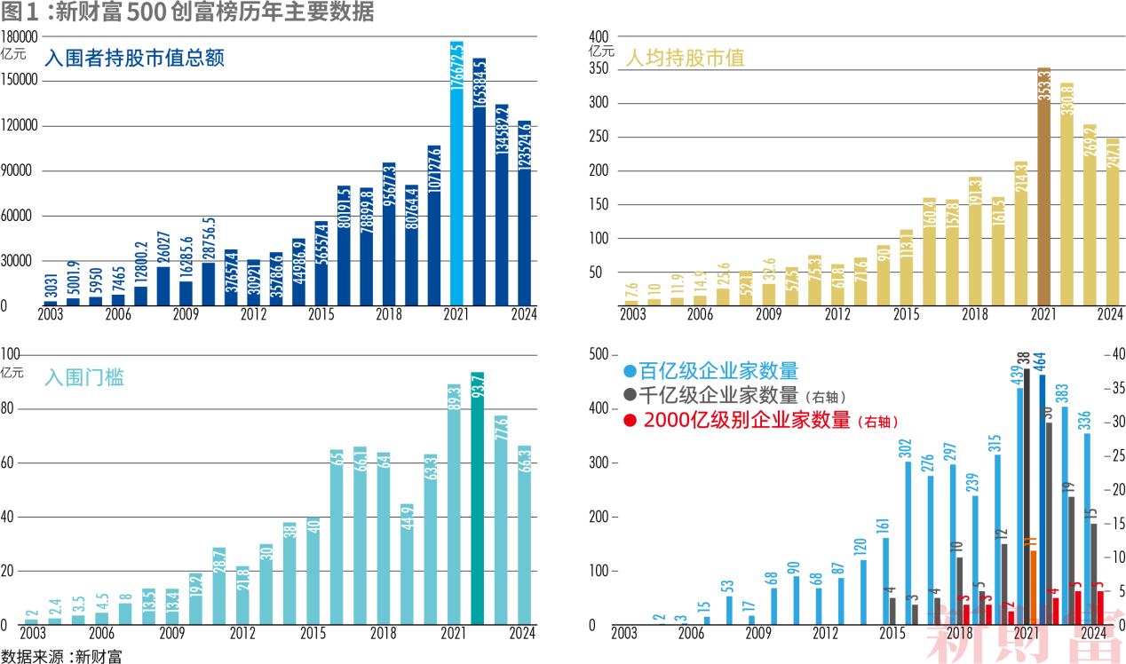 这是新财富第22度发布500创富榜,今年上榜的500位企业家(或家族)总持股市值为12.3万亿元,平均持股市值为247亿元,上榜门槛为66.3亿元,持股市值百亿以上的企业家为336位。