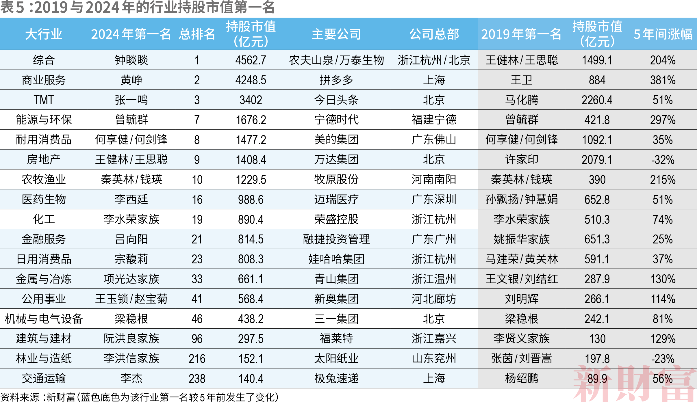 以5年期来衡量,17个大行业中,只有5个行业首富成功守擂,12个行业发生了变动。